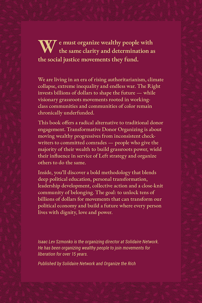 This book offers a radical alternative to traditional donor engagement. Transformative Donor Organizing is about moving wealthy progressives from inconsistent check-writers to committed comrades — people who give the majority of their wealth to build grassroots power, wield their influence in service of Left strategy and organize others to do the same.